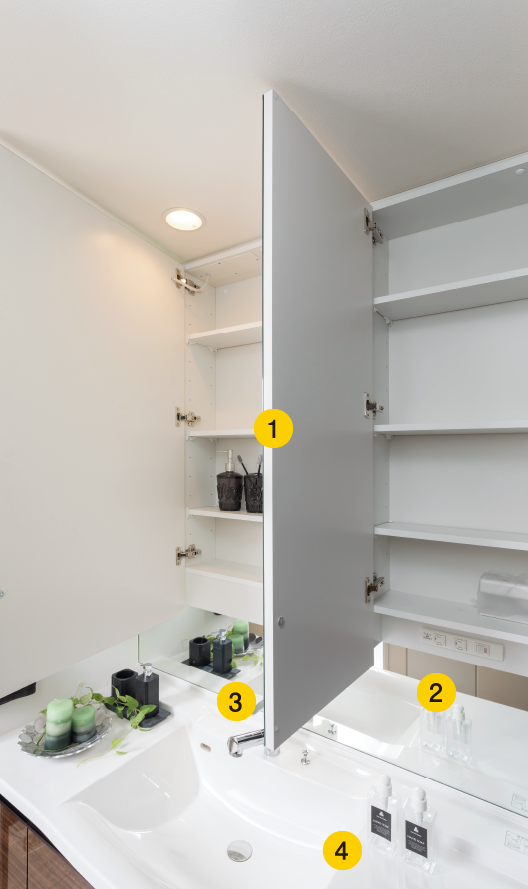 三面鏡の内部には収納棚を設けているため、スキンケア、ヘアケア用品などの洗面用具をスッキリと収納することができます。